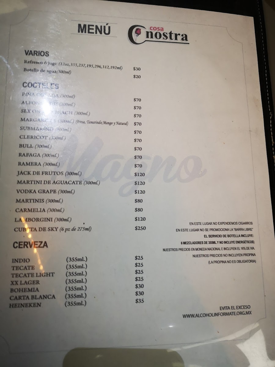 Welcome to La Cosa Nostra, where culinary delights meet vibrant nightlife right in the heart of Ciudad de México. Nestled at Av. Cuauhtémoc 39, La Romita, Roma Nte., this spot creates a party atmosphere perfect for socializing and indulging. Immerse yourself in a menu that promises an exquisite array of dishes complemented by an impressive selection of drinks, ranging from refreshing beers to expertly crafted cocktails.